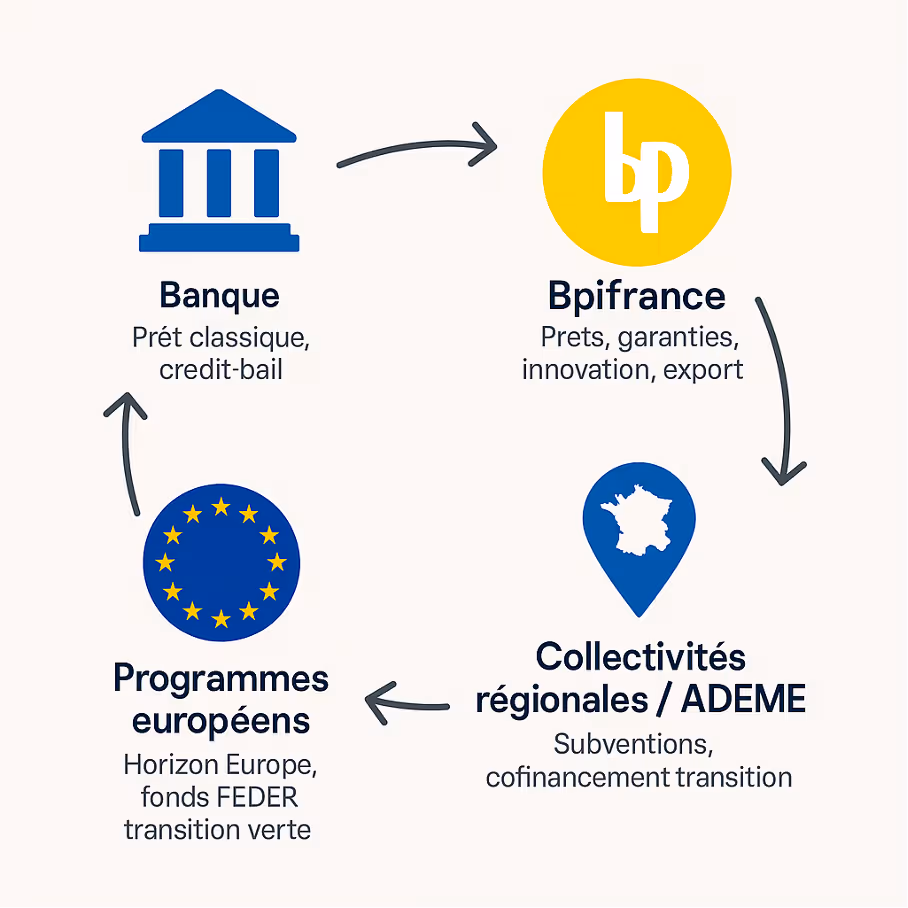 Exemple : Une PME industrielle modernisant ses machines peut obtenir un prêt bancaire garanti par Bpifrance, complété par un prêt vert.