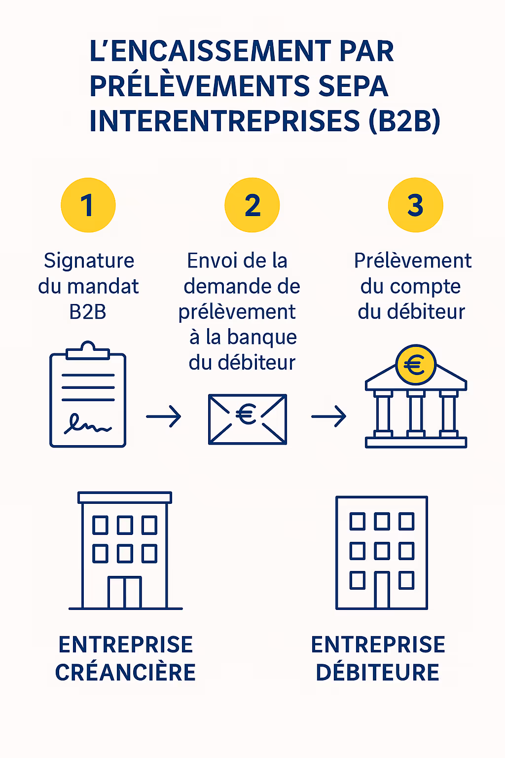 Le débiteur (client professionnel) signe un mandat B2B qui autorise son créancier (fournisseur, prestataire, bailleur, etc.) à prélever directement les sommes dues sur son compte bancaire. Ce mandat doit être enregistré par la banque du débiteur.